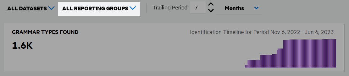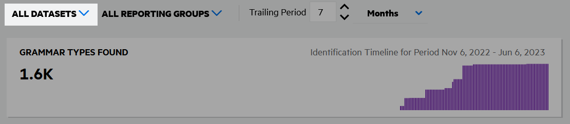 View the data for all datasets or an individual dataset. When you select to view data for all datasets, you can further refine the view by any tag reporting group in any dataset. When you select to view an individual dataset, you can refine the view by reporting groups within the selected dataset.