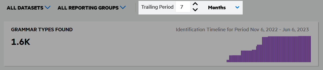 View data for a specific time period using the Trailing Period selection at the top of the dashboard. Define the number of previous days, weeks, months, or years to view data for. The default view is set to seven days (the past 7 days, including the current day).