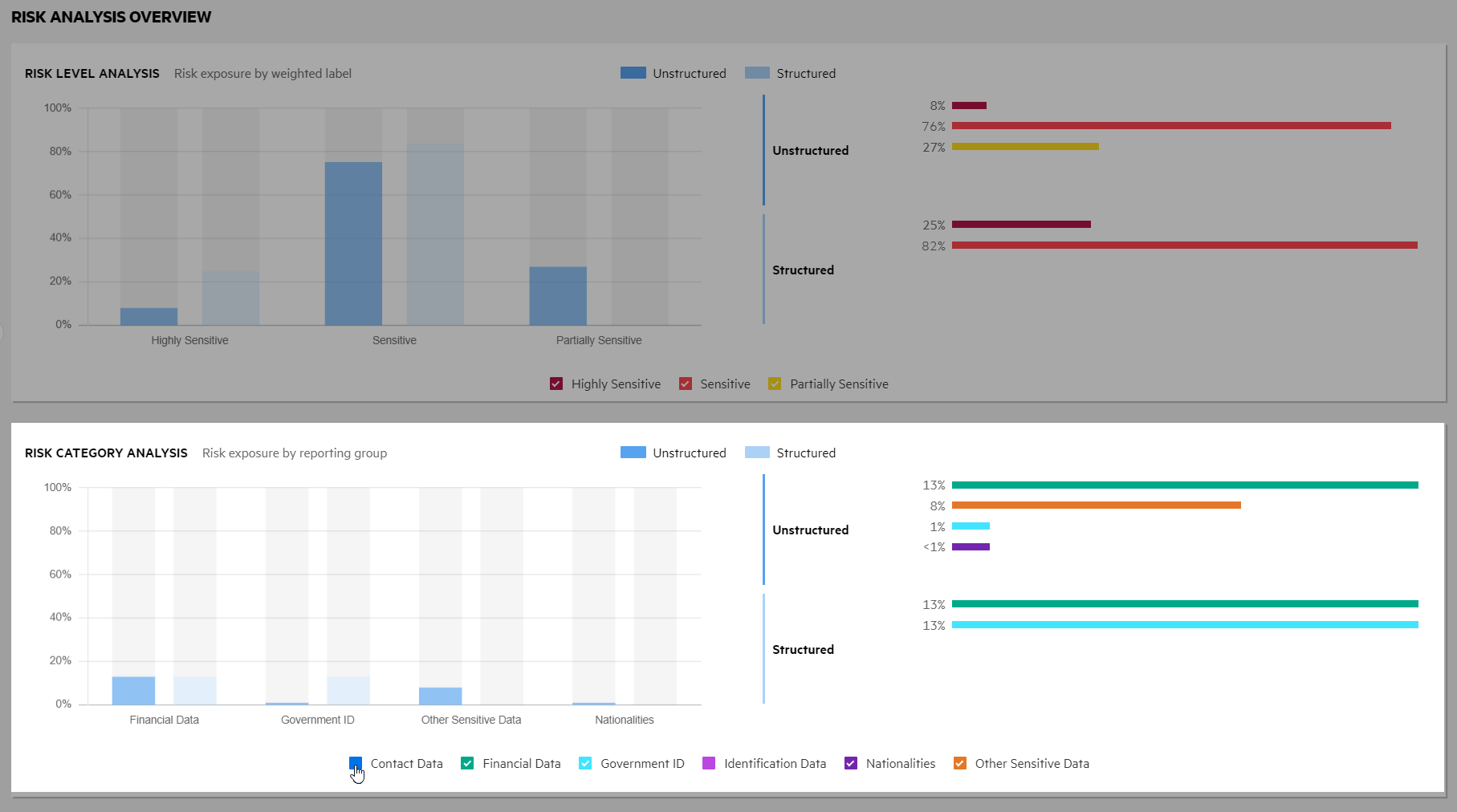 The Risk Analysis Overview dashboard depicts the potential risk exposure associated with your unstructured and structured data under management. Potentially sensitive data is identified by the weighted labels that are applied as the data is analyzed.