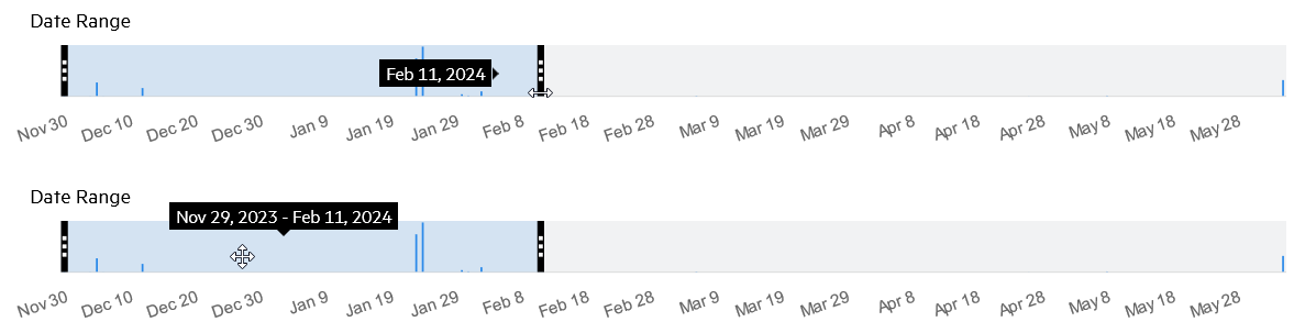 View the data for a specific timeframe using the date range selector beneath the chart. You can adjust the start and end dates independently, or move the entire timeframe. To adjust the start and end dates, click and drag the control bar on either end; the date displays onscreen as you move the control bars. To move the entire timeframe, click anywhere within the selected timeframe and drag to the desired point in time; the date range displays onscreen as you move the selected timeframe.