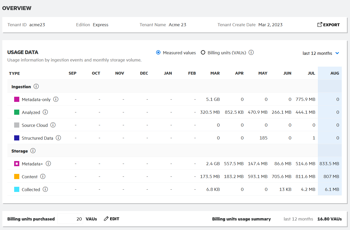 You can view your usage information by Measured values or Billing units (VAUs) for the last 12 months or for a given calendar year. Measured values reflect the size on disc. VAUs are Voltage Authorization Units and reflect the number of licensed units used by ingestion events or the monthly storage volume.