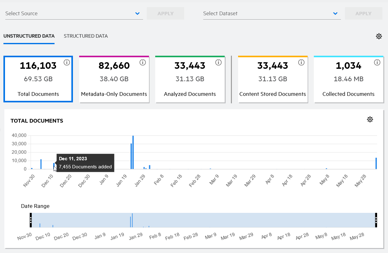 Click any of the count cards on the UNSTRUCTURED DATA tab to view Total Documents, Metadata-Only Documents, Analyzed Documents, Content Stored Documents, or Collected Documents.