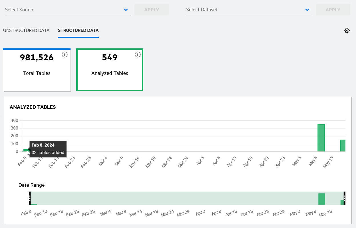 Initial view for both unstructured data and structured data shows data for all datasets for all sources. Use the filters above the count cards to view data for specific sources and datasets. From the source or dataset filter, select one or more sources or datasets and click the APPLY button associated with the filter. If you select one or more sources first and click APPLY, the dataset filter adjusts to list only the datasets associated with the selected sources. To clear selections in the filters, click the associated with the desired source or dataset and then click APPLY.