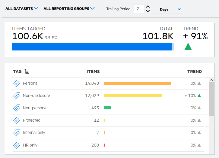means that the overall percentage of sensitive data identified by tags has decreased by 2% over the defined timeframe. A 0% trend means that there has been no change in the trend or there has been no data added within the defined timeframe.