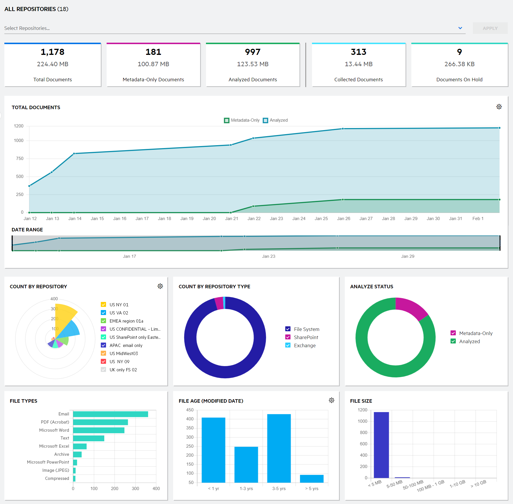 Using the Total Documents card, view the total number of documents managed. This includes documents for which metadata only or metadata and content are processed (indexed only), and documents that are collected (metadata and content indexed, and binary stored). Extracted attachments are not included in the count. Documents within email archives and compressed archives are included in the count only if they were processed as part of the repository's Primary Capture Rules.