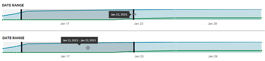 ) and select to view the data by document count or size.. View the data for a specific timeframe using the date range selector beneath the chart. You can adjust the start and end dates independently, or move the entire timeframe. To adjust the start and end dates, click and drag the control bar on either end; the date displays onscreen as you move the control bars. To move the entire timeframe, click anywhere within the selected timeframe and drag to the desired point in time; the date range displays onscreen as you move the selected timeframe.