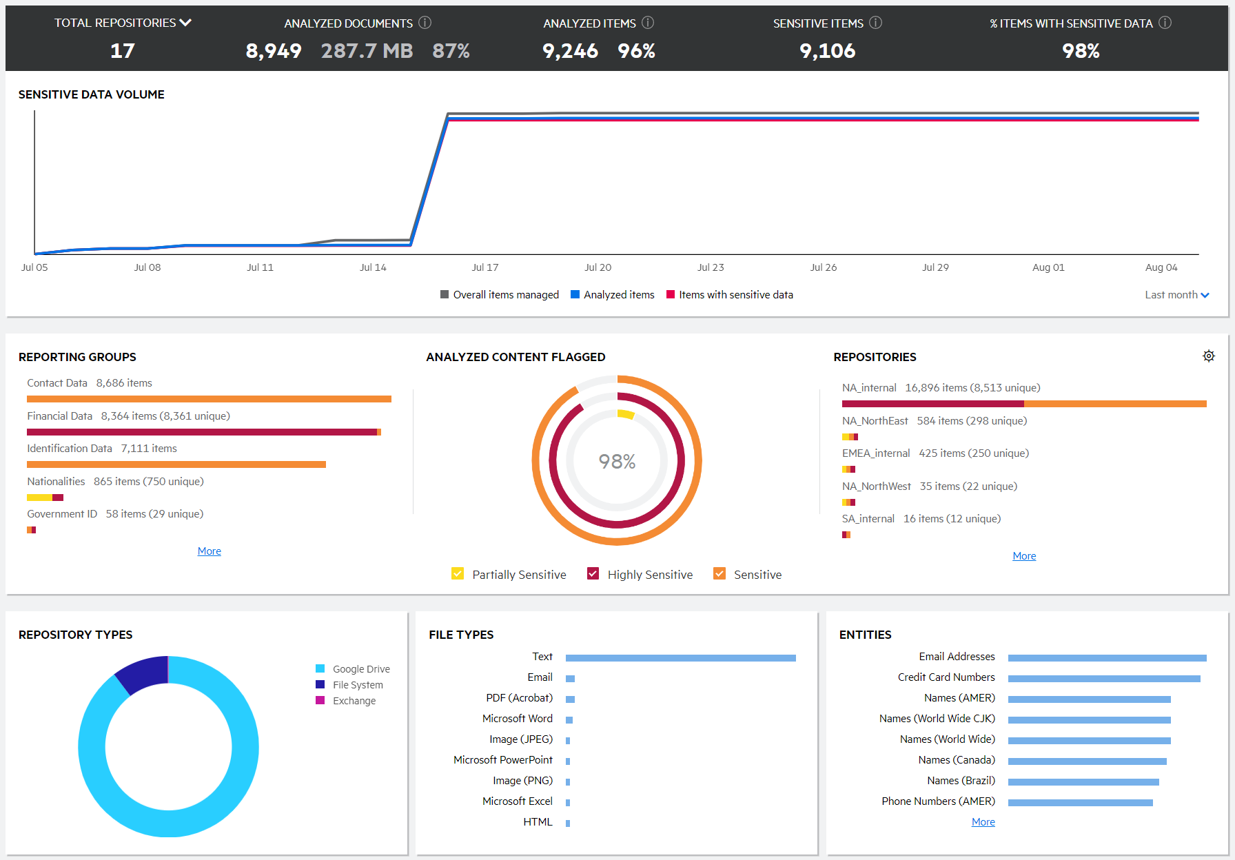 The Analyzed Sensitive Data dashboard includes the following graphical views as it relates to your analyzed sensitive data under management.
