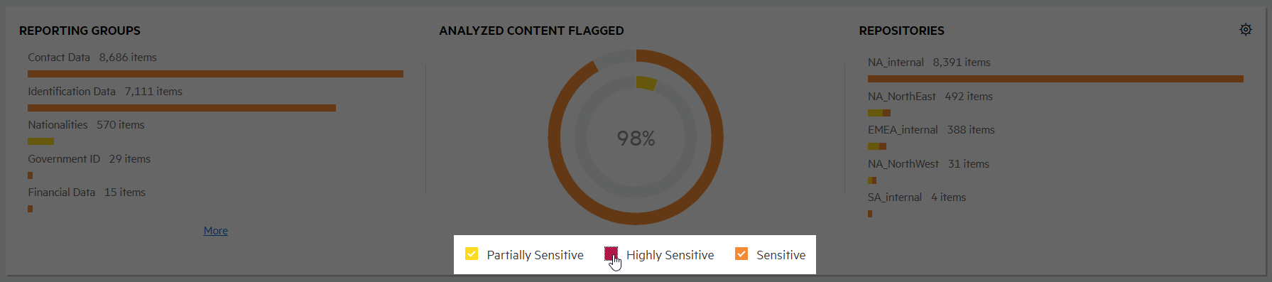 The Analyzed Sensitive Data dashboard depicts the distribution of sensitive data under management. Content is identified by the weighted labels that are applied as content is processed (metadata and content indexed or collected).