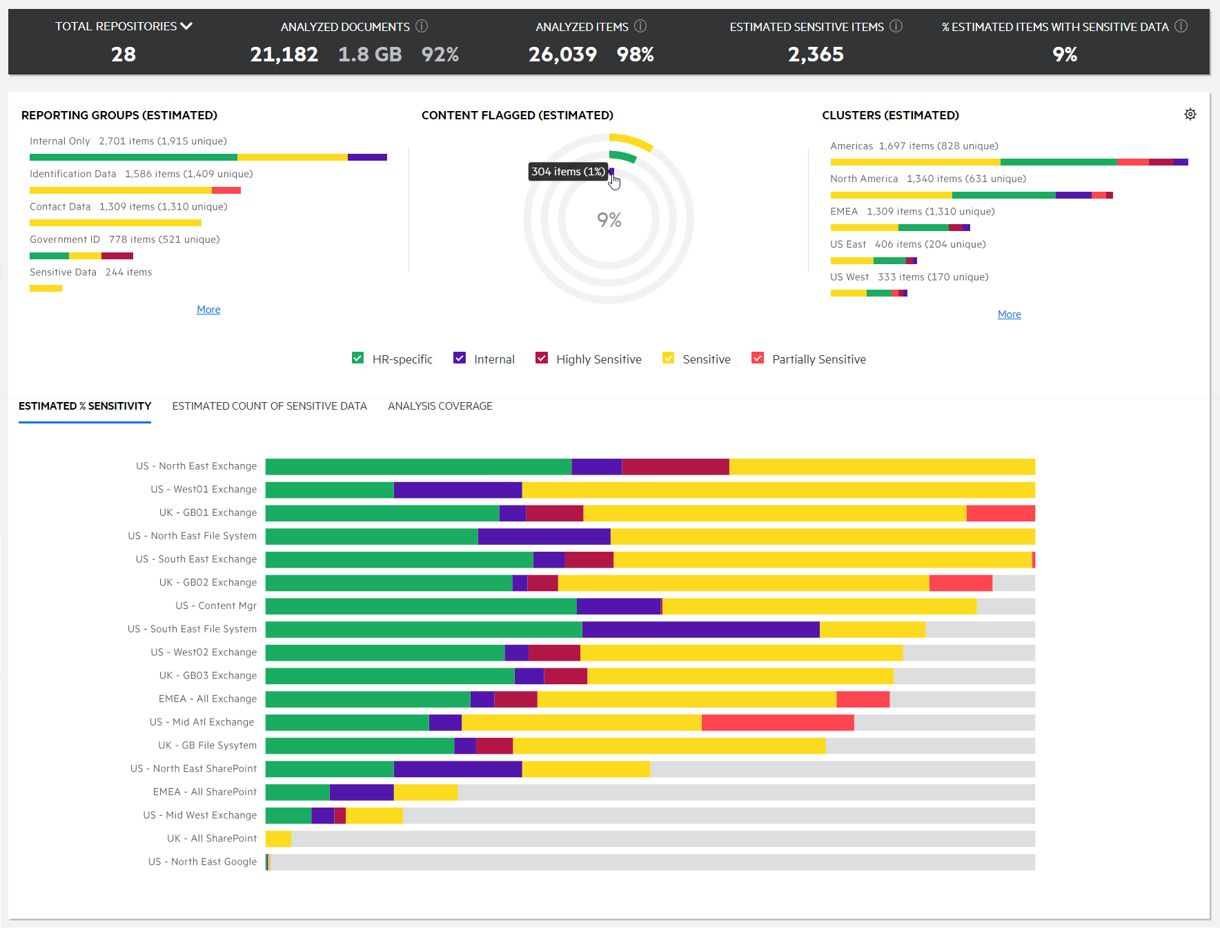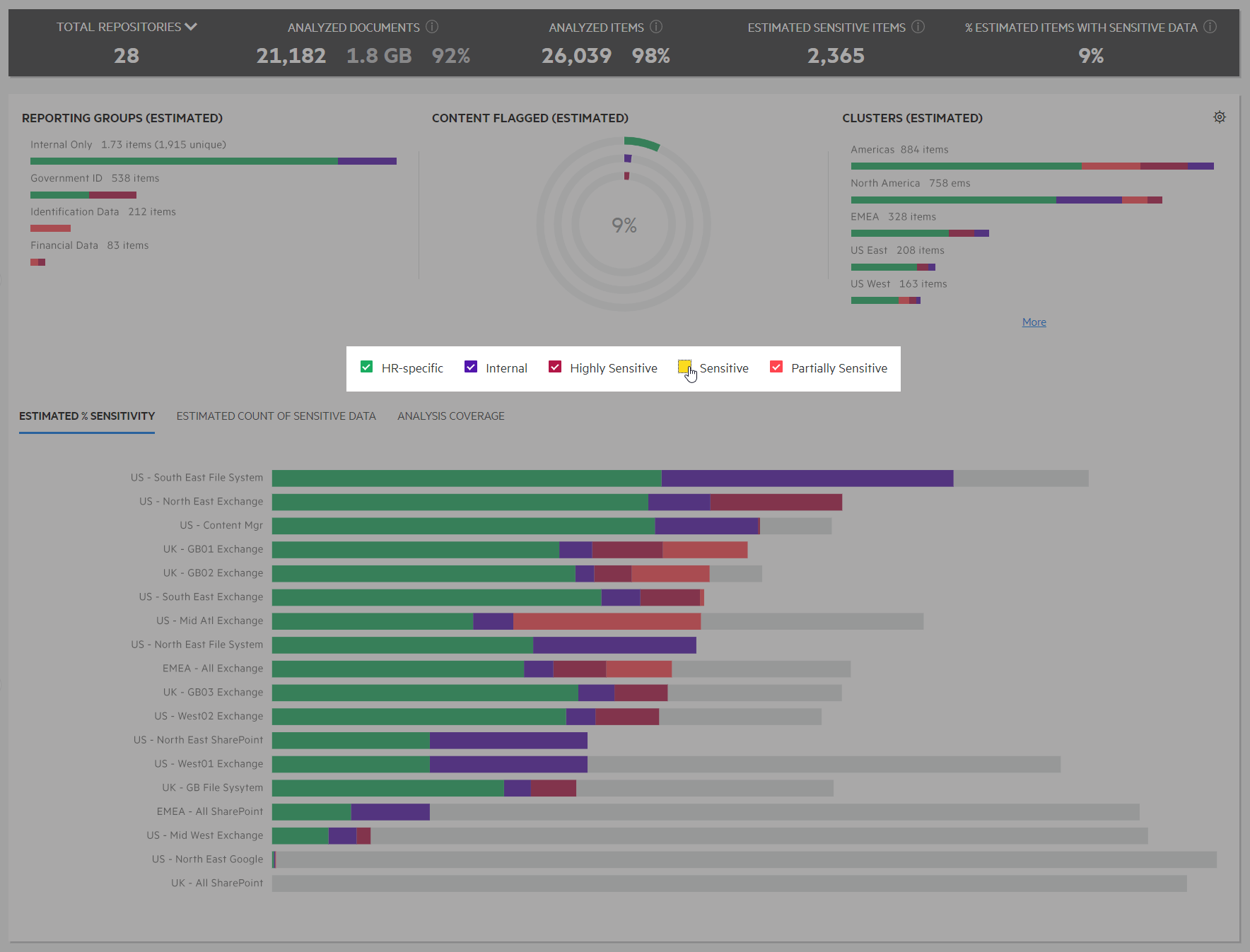 TIP: If all items under management have been analyzed (content indexed), the information about your estimated sensitive data will be the same as presented on the Analyzed Sensitive Data dashboard.