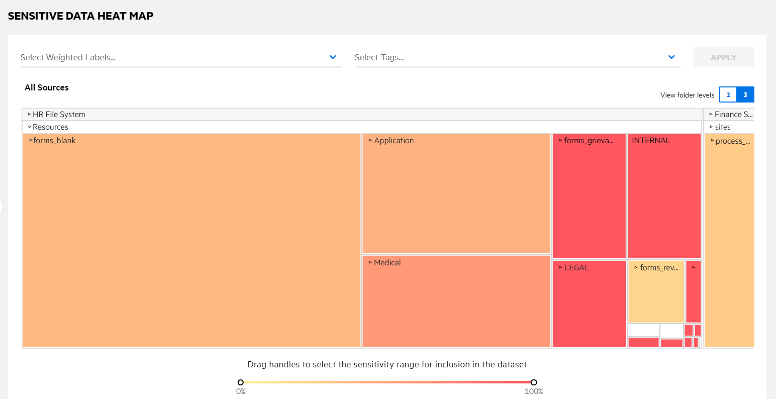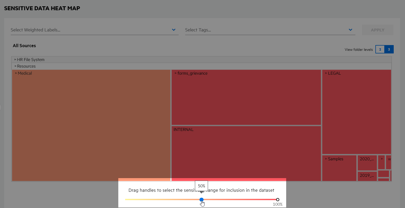Select one or more weighted labels and tags to focus the heat map based on a desired sensitivity. Click in a filter, select the desired labels or tags and then click APPLY; click the associated X for a selected weighted label or tag to remove it from the filter.