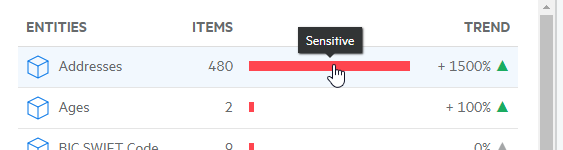 The Sensitive Trend Analysis dashboard depicts the volume of sensitive data under management. Content is identified by the automated tags that are applied as content is processed. You can see the number of items tagged per tag and per grammar rule as well as the trend for the selected time period.