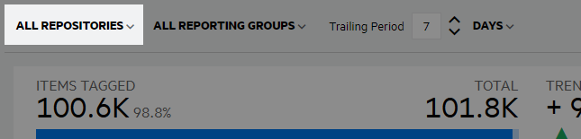 View the data for all repositories or an individual repository. When you select to view data for all repositories, you can further refine the view by any tag reporting group in any repository. When you select to view an individual repository, you can refine the view by reporting groups within the selected repository.