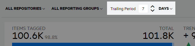 View data for a specific time period using the Trailing Period selection at the top of the dashboard. Define the number of previous days, weeks, months, or years to view data for. The default view is set to seven days (the past 7 days, including the current day).