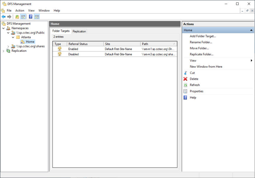 If a DFS namespace is used for high availability, such as ensuring that users can access a replicated copy of their data, it might be appropriate to create multiple targets in a DFS link and disable all but one. If the enabled link target becomes unavailable, an administrator can disable the downed target and enable a replication target. As long as only one target is enabled for a given DFS link, File Dynamics can successfully provision and manage storage through the DFS path.
