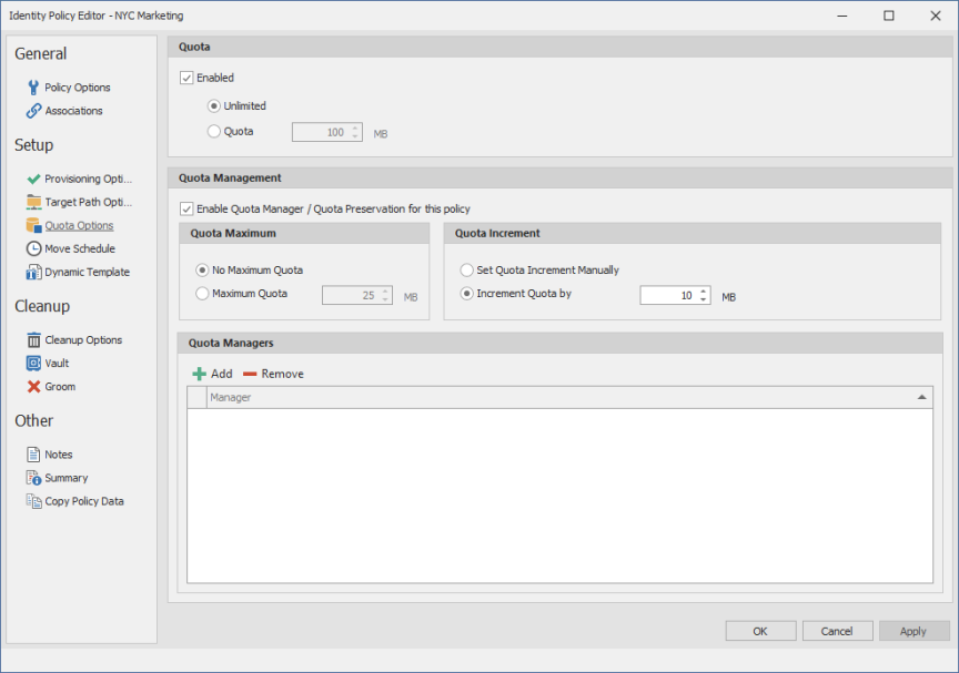 - Set up quota managers by filling in the following fields: