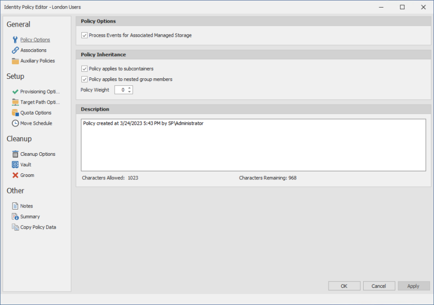 A policy in File Dynamics is the means by which the product provisions, manages, deletes, and archives storage. The parameters within an Identity-Driven policy dictate where user storage is created, what permissions are granted, what quota to assign, what to do when a user is deleted, and much more.