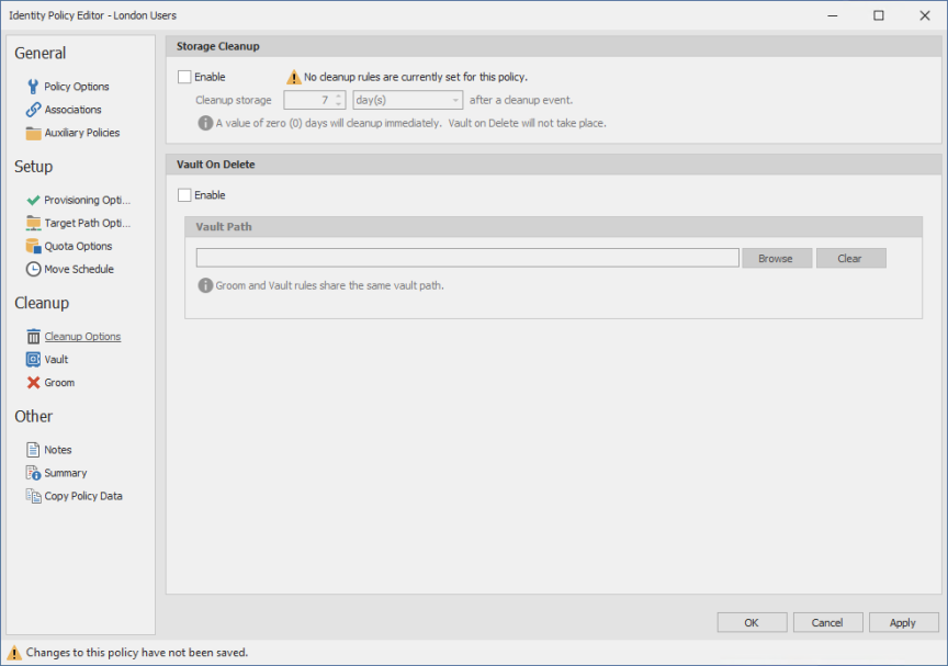 - If you want user storage associated with this policy vaulted, in the Vault on Delete region, select the Enable check box and use the Browse button to indicate a path to the vault location.