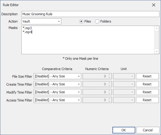 - For example, if you select Greater than from the File Size Filter drop-down menu, enter 2 as the Numeric Criteria, and select MBs as the Unit setting, the groom rule in this example vaults all MP3 and MP4 files greater than 2 MB. Setting additional filters narrows the scope of the grooming action even more.