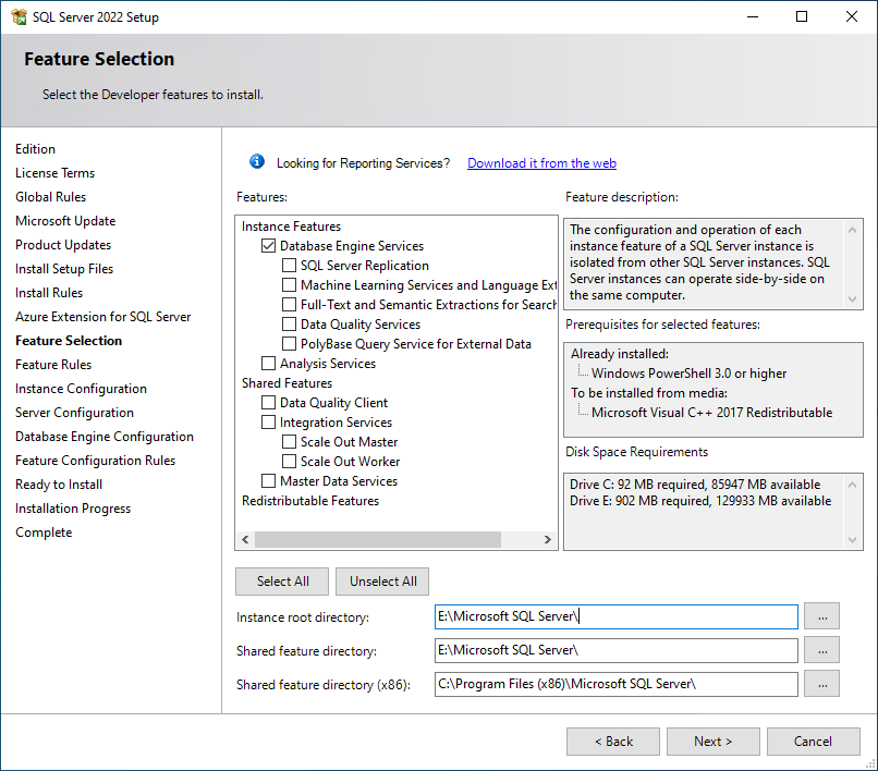 NOTE: For larger installations, consider installing the SQL Server instance on a separate volume by changing the Instance Root Directory path parameter.