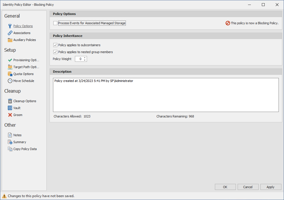 - A description at the right of the check box indicates that the policy is now a Blocking policy.