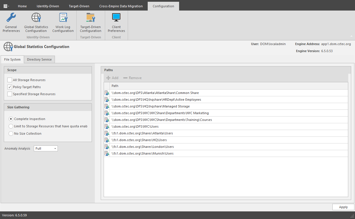 This configuration will cause the GSR Collector to enumerate all shares found in Storage Resources. During the enumeration, child folders at the root of shares are inspected for anomaly analysis and checked to determine if they have a quota applied to them via FSRM. If they have a quota, FSRM is queried to obtain it. This configuration is more efficient than Complete Inspection. However, if you have folders that do not have quota, there will be size data missing from Global Statistics and Policy-based Path Redistribution that would skew your results.