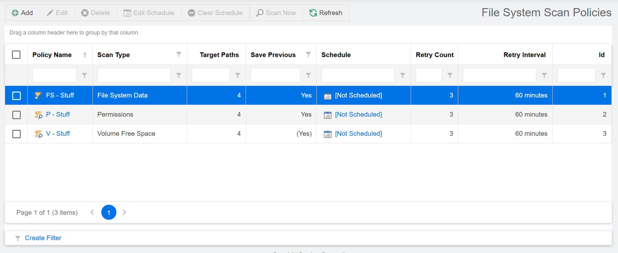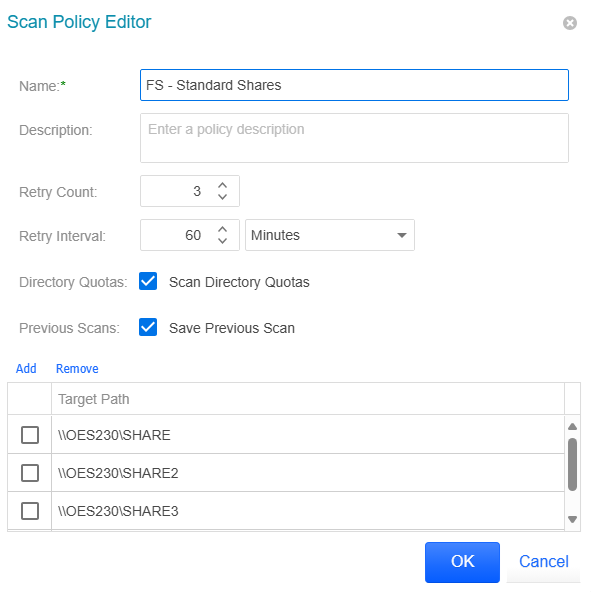 IMPORTANT: The scan policy requires a unique name. If you attempt to use an existing name, File Reporter OES generates an error.