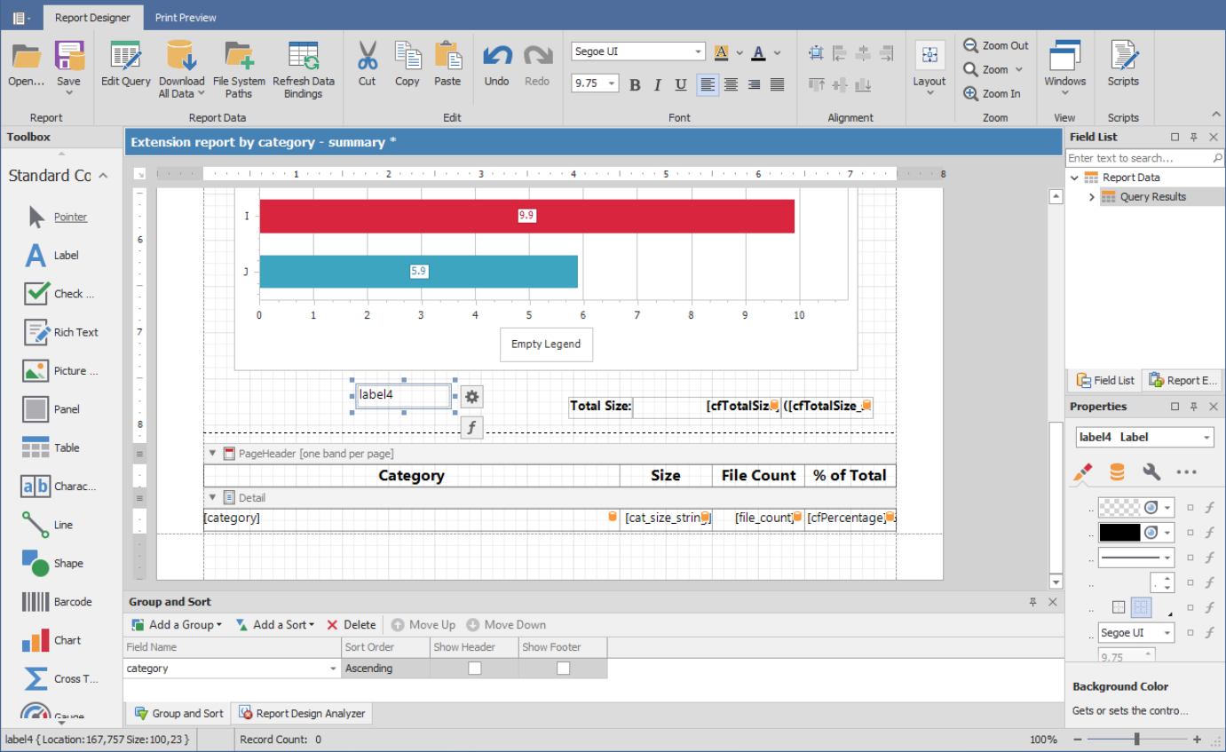 - From the Field List, hold down the Control key, select the two new fields you just created, then drag them to the Total Size label on the grid.