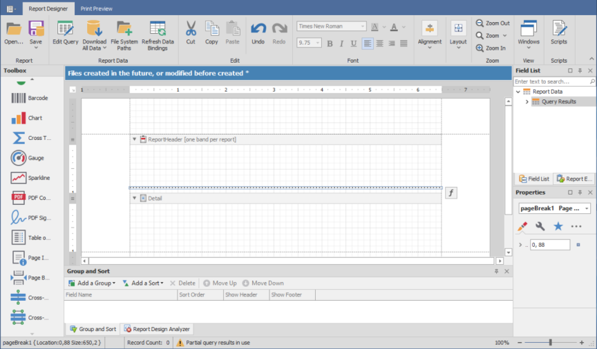 For example, to fill the first page, you might extend the border down to the 8" mark. - From the Standard Controls region, click and drag a Page Break to the bottom of the band.