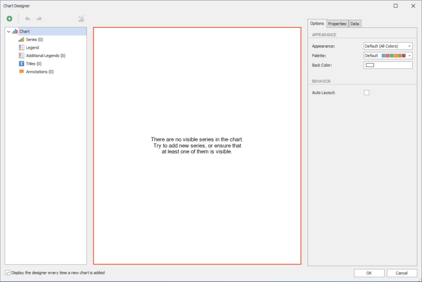 - In the Chart Designer, below the Chart menu, click the + that pertains to the Series option and select the Bar option.