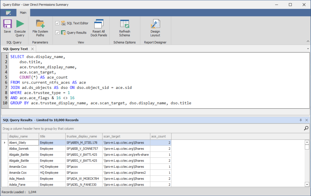 This example extends a "Direct User Assignment" Custom Query report which identifies user accounts that have been assigned permissions directly to folders (as opposed to using group membership) and shows a summary of the count of direct permissions per user by share path.