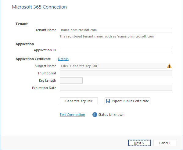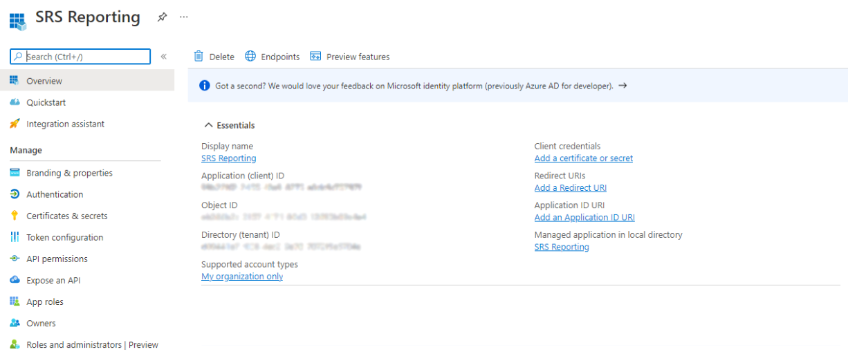 Application ID: Enter the name of the application you registered and configured previously. For reference, you can identify the application ID in the Azure Active Directory admin center: