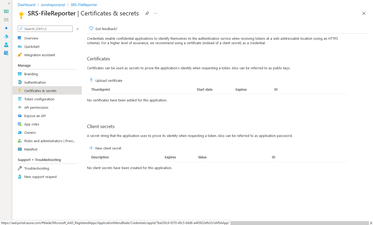 Click Certificates & secrets in the Azure Active Directory admin center.