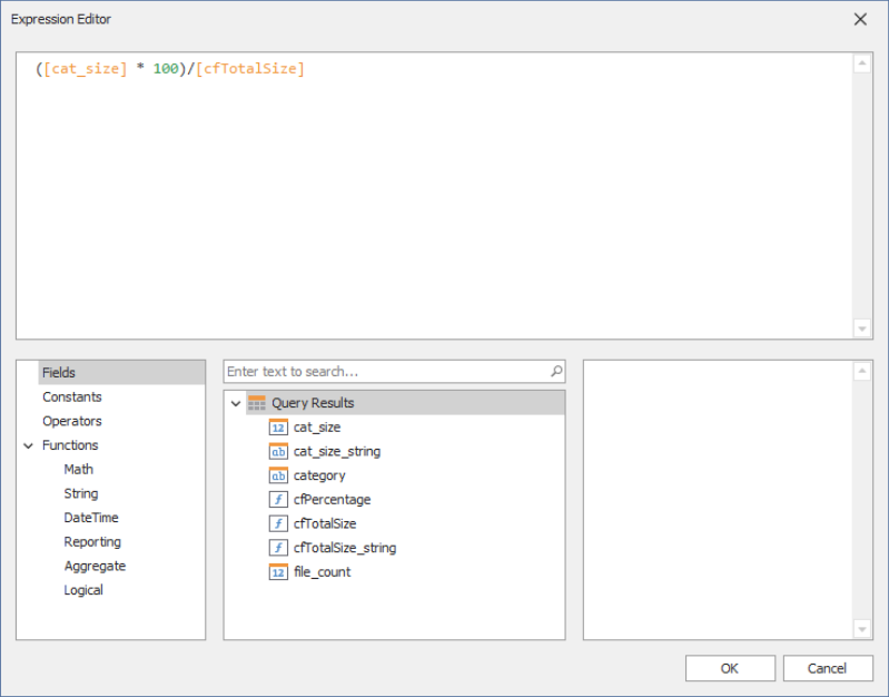 - Double-click cfTotalSize you created earlier from the middle column and click OK.