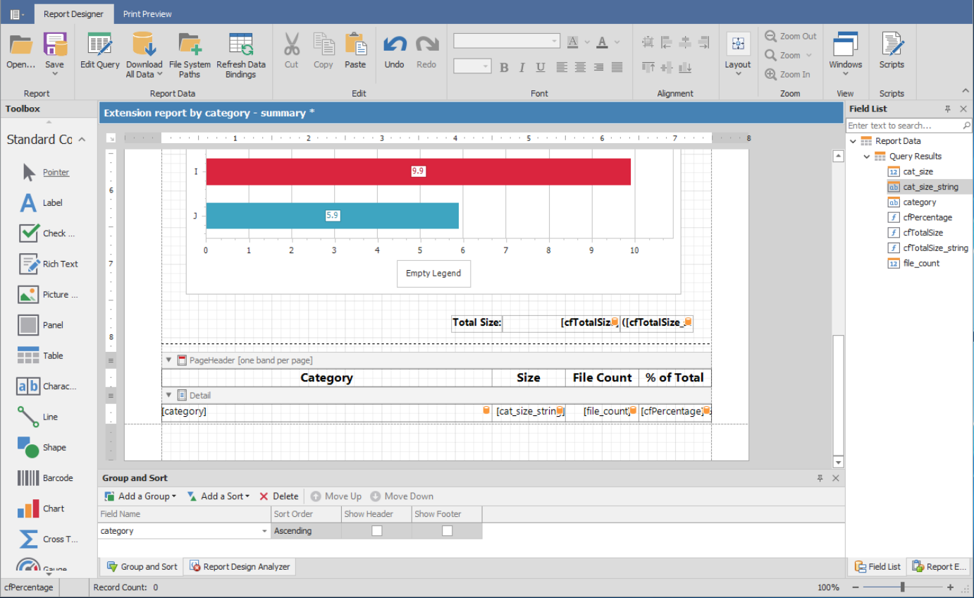 After creating a Custom Query report through either the Report Designer Query Editor or the Query Editor built into the browser-based administration interface, you can then design the report layout.