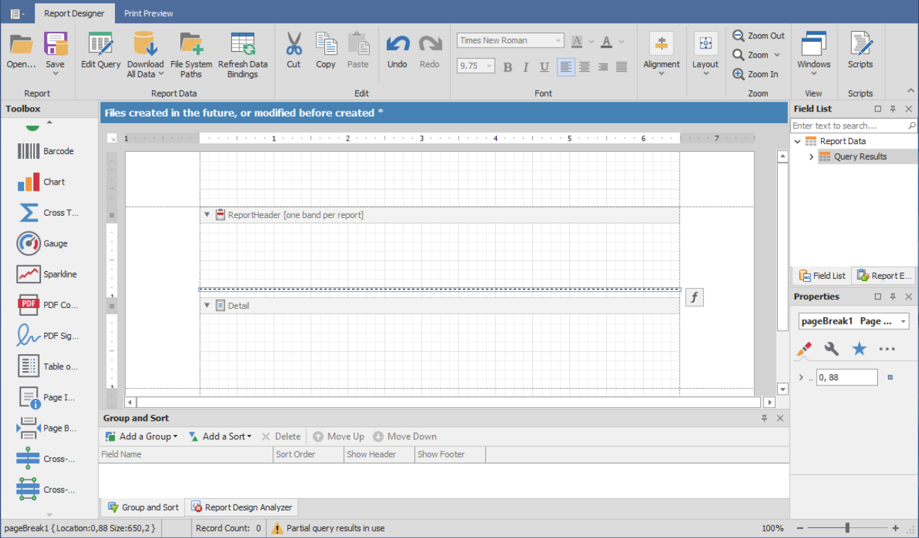 - Click and drag a Page Break from the Standard Controls region to the bottom of the band.