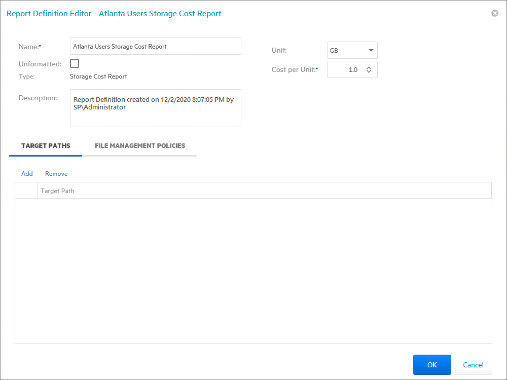 Storage Cost reports indicate storage costs according to prices established in the Cost per Unit setting of the Report Definition editor. You can use this report to determine which users or groups are being irresponsible with network storage practices.