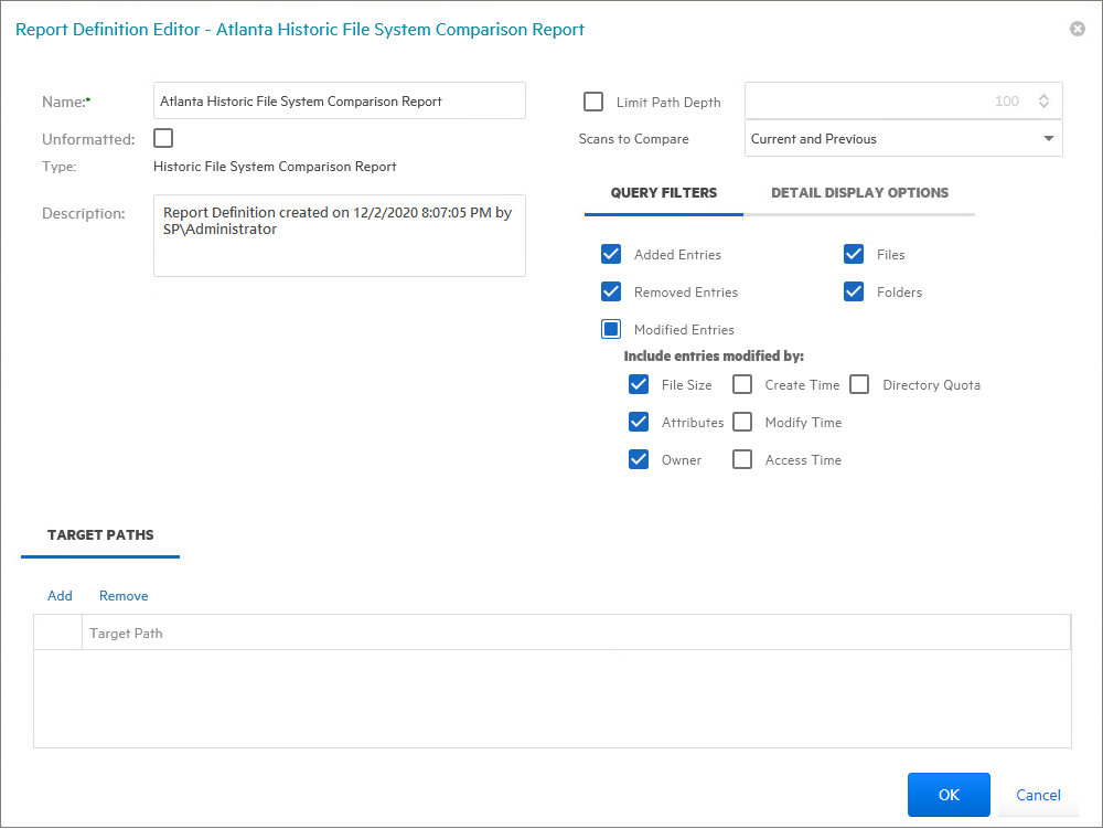Modified Entries: If you want the report to list files or folders that have been modified since the older scan, leave this check box selected.