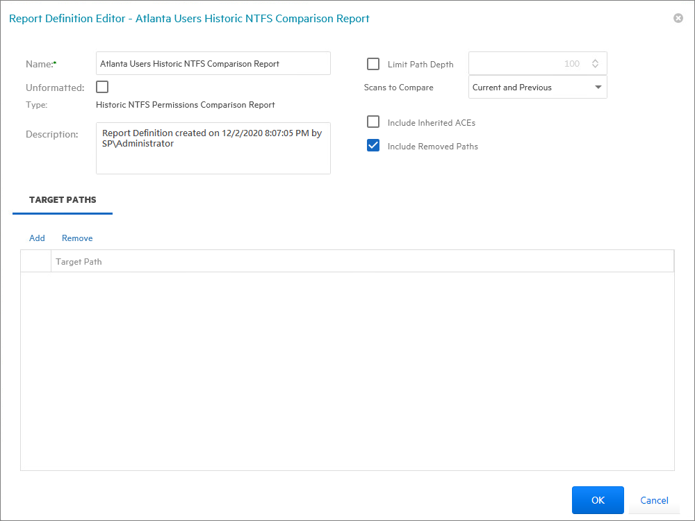 Historic Comparison reports specify the differences between two similar scan types of the same target system. For example, if you had a Previous Permissions scan of a Windows share and a Current Permissions scan of the same share, you could generate a Historic NTFS Permissions Comparison report that would specify the differences in permissions between the two points in time that the scans were taken.