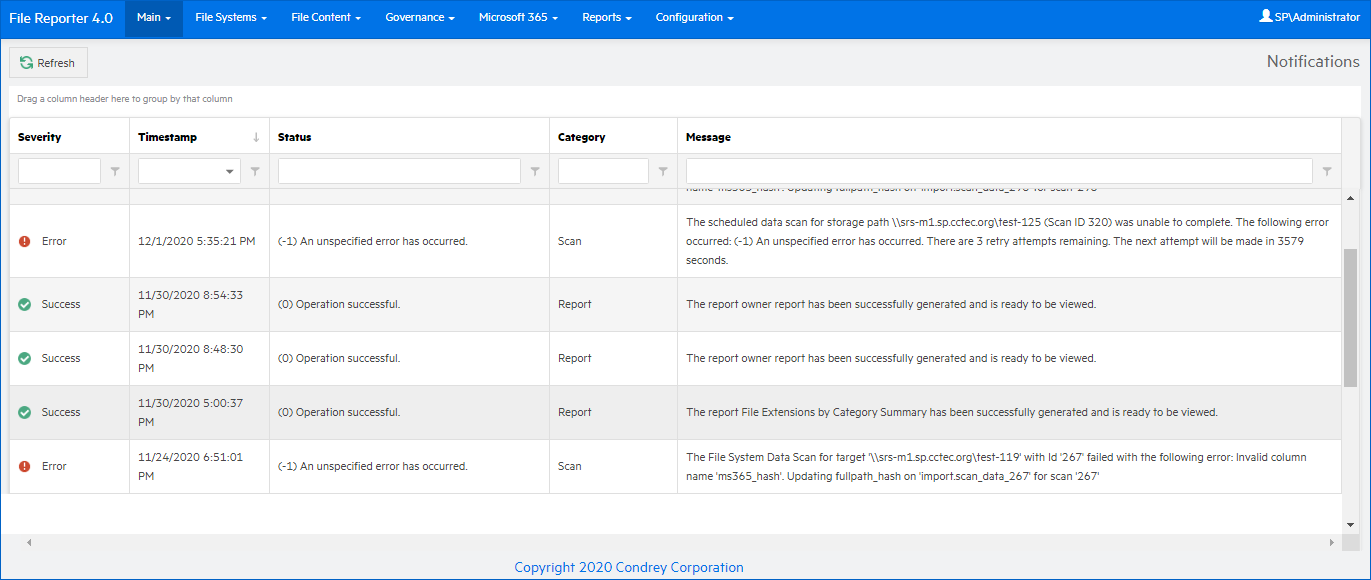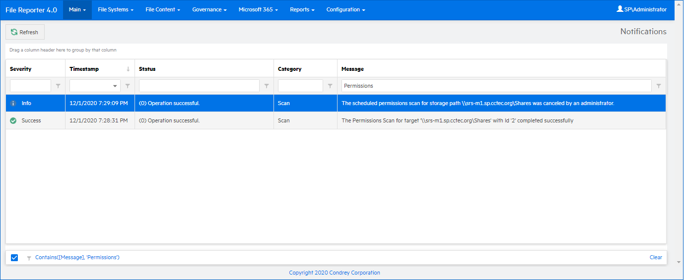 File Reporter displays notifications for successfully completed scans, failed scans, completed reports, failed reports, errors, warnings, and other information. You can use the filtering options to list only the notification types you want.