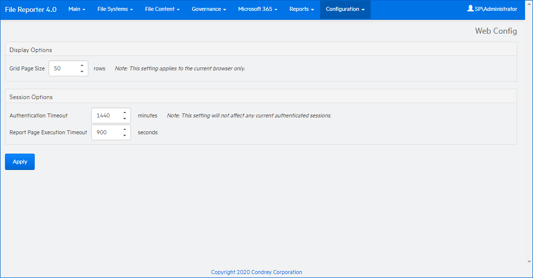 The Configuration menu is the means of establishing and modifying configuration settings within File Reporter.