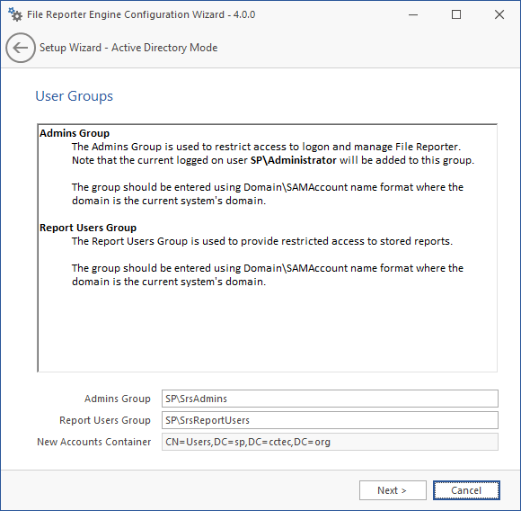 Specify the name for the Admins Group and Report Users Group, or use the default names.