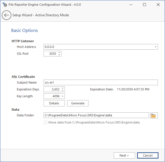 Move data from (Enabled only during an upgrade): Having this check box selected indicates that content from the Engine’s data folder for the previous version of File Reporter, will be moved to the path specified in the Data Folder field and the original path with be removed. If this check box is not selected, it will use whatever path is specified in the Data Folder field, including the original path.