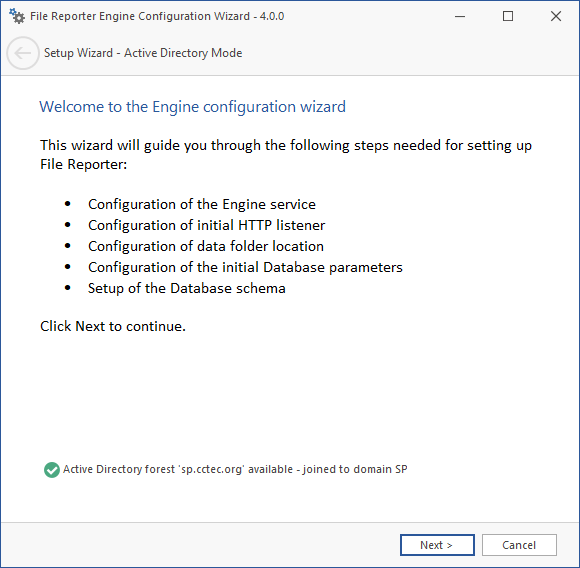 If you are upgrading from a previous version of File Reporter, the Proxy Account and Proxy Rights Group fields will specify the existing proxy account and proxy rights group.