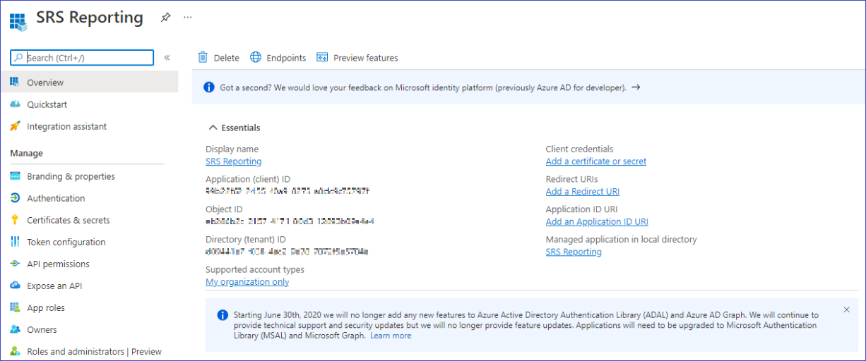 For your reference, you can identify the application ID in the Azure Active Directory admin center by clicking App registrations, clicking the listed registered application, and then copying the Application (client) ID listing into the Application ID field of the File Reporter Agent365 wizard.