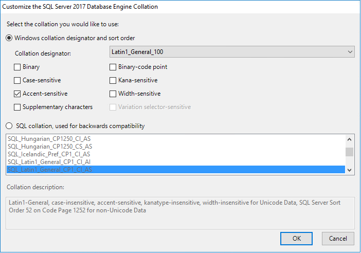 For example, in North America, an acceptable collation would be Latin1_General_100 with the Accent-sensitive check box selected.