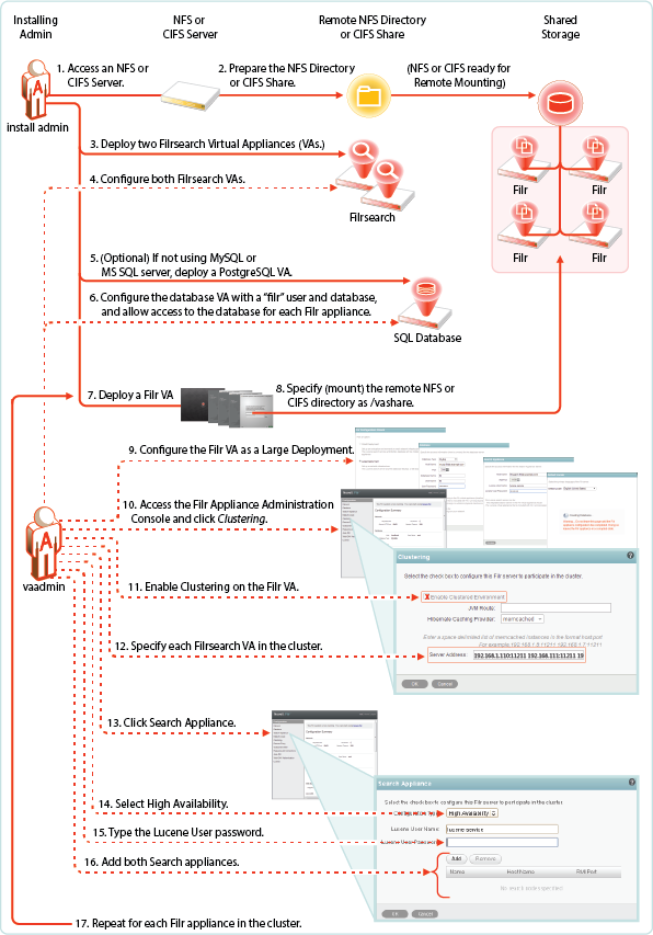 Filr clustering involves two or more Filr VAs sharing the same NFS or CIFS data storage location (/vashare). You can only create a cluster if your Filr appliances were deployed pointing to the same /vashare disk.