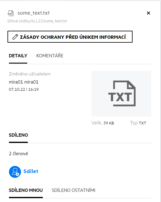 Obsahuje soubory a složky, které jste sdíleli s jinými uživateli. V této oblasti můžete spravovat práva ostatních uživatelů k souborům, které s nimi sdílíte. Můžete práva odvolávat, udělovat další práva a podobně.