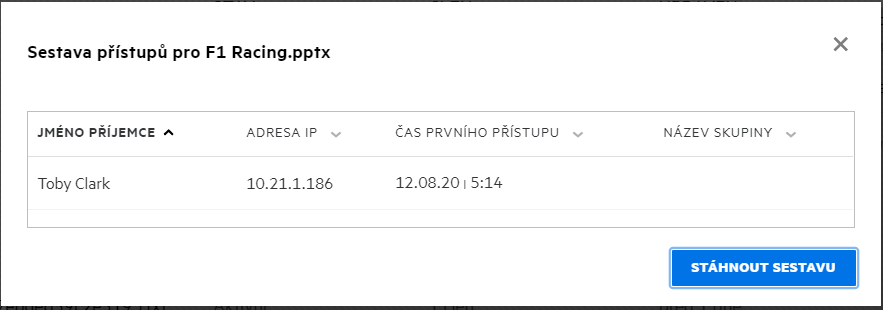 Sestava obsahuje informace o přístupu ze strany příjemců, například kdo přístup k souboru využil, adresu IP počítače, který k tomu použil, a datum a čas přístupu k souboru. Kliknutím na Stáhnout sestavu si sestavu můžete stáhnout ve formátu PDF.