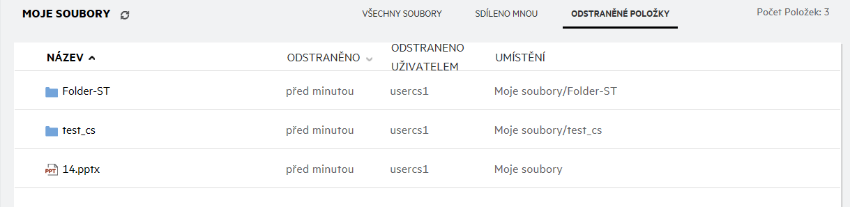 Oblast Odstraněné položky obsahuje následující sloupce: