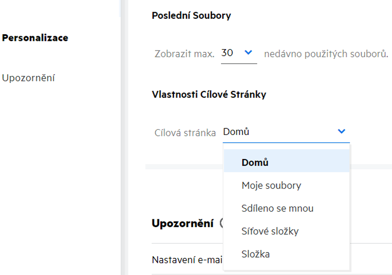 Pokud ke složce nastavené jako cílová stránka vyprší přístup nebo je odvolán správcem, nastaví se jako výchozí cílová stránka automaticky domovská stránka.
